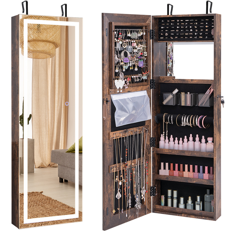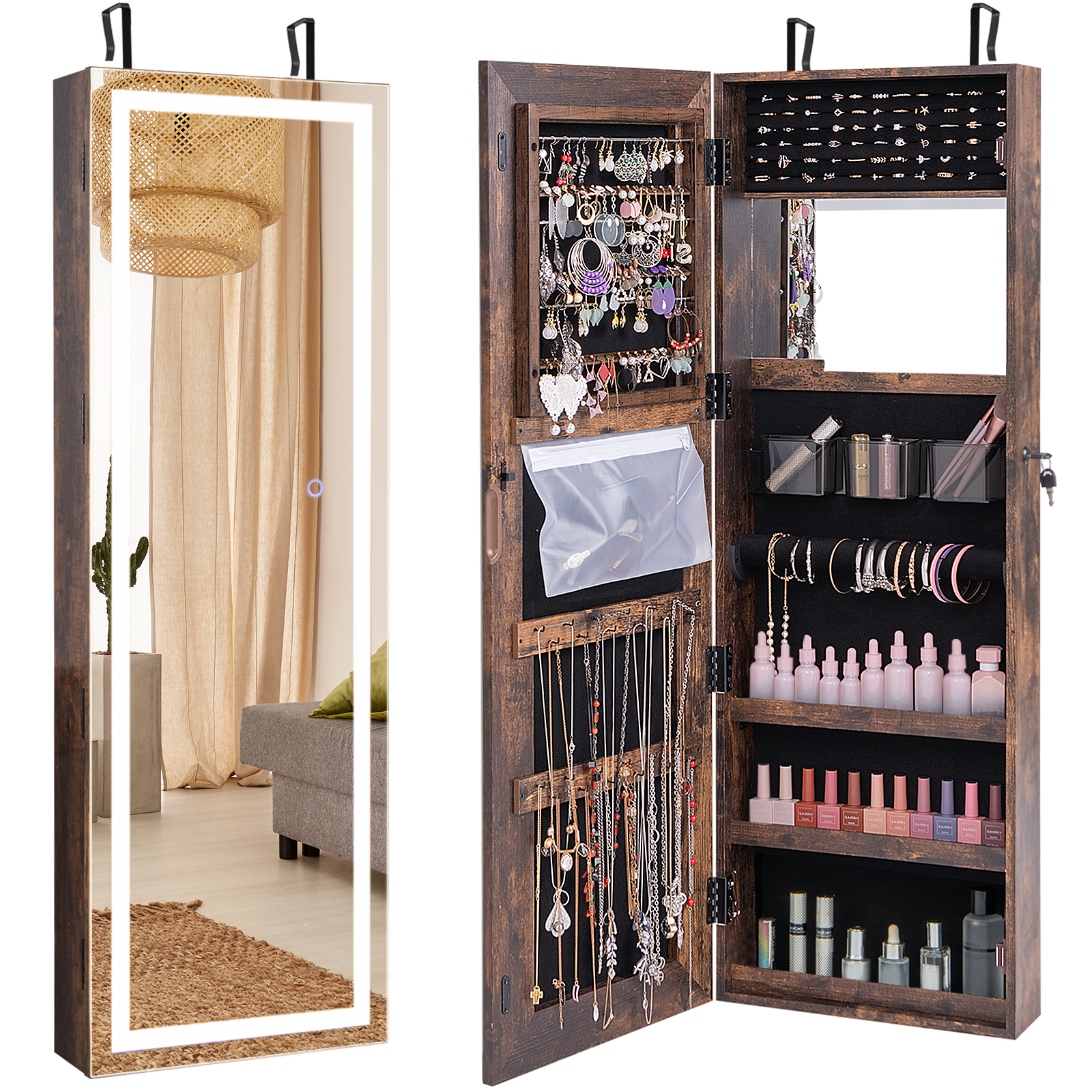 Mirrored Jewelry Armoire with Full Length Mirror and 2 Internal LED Lights-Rustic Brown